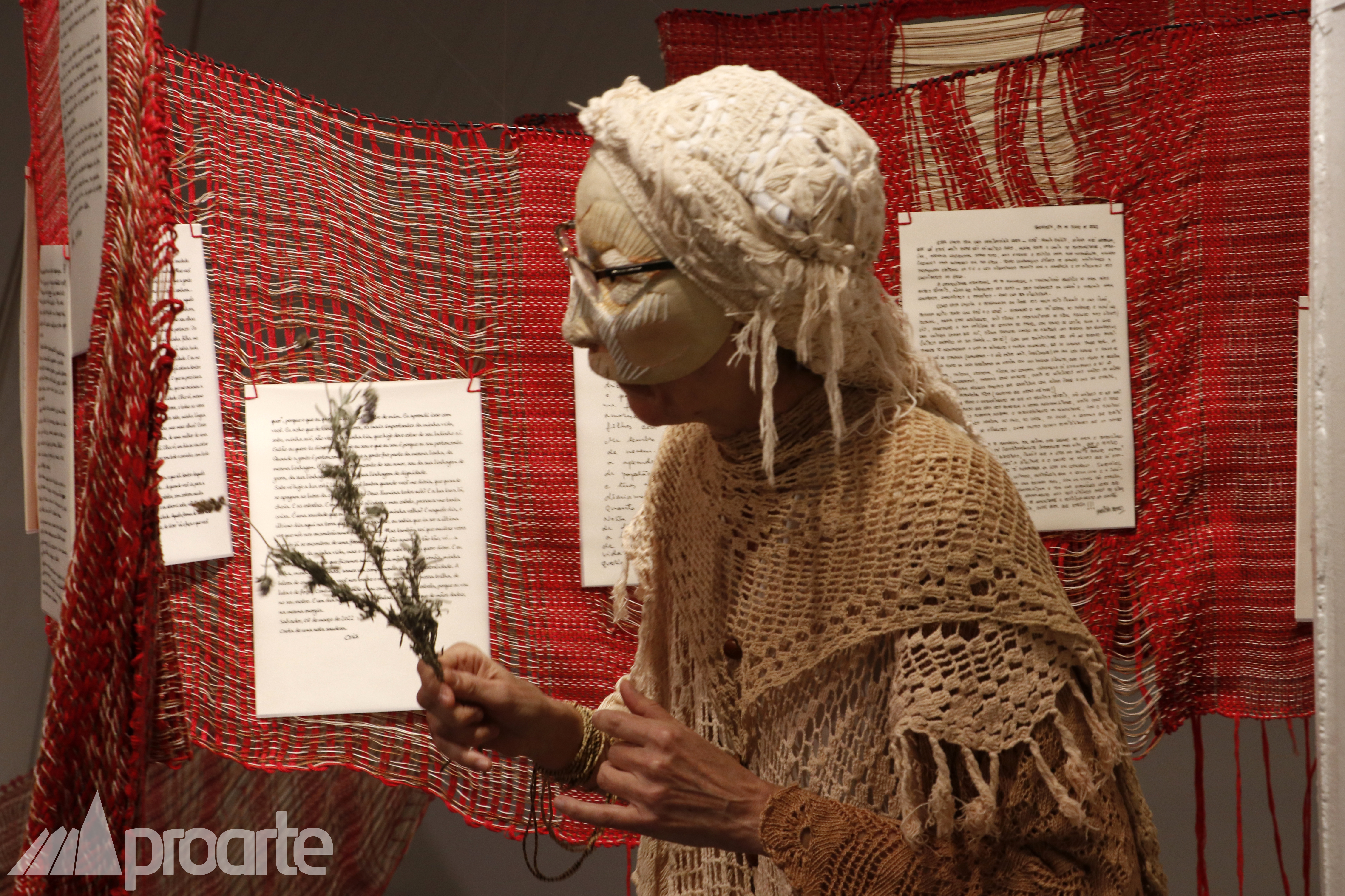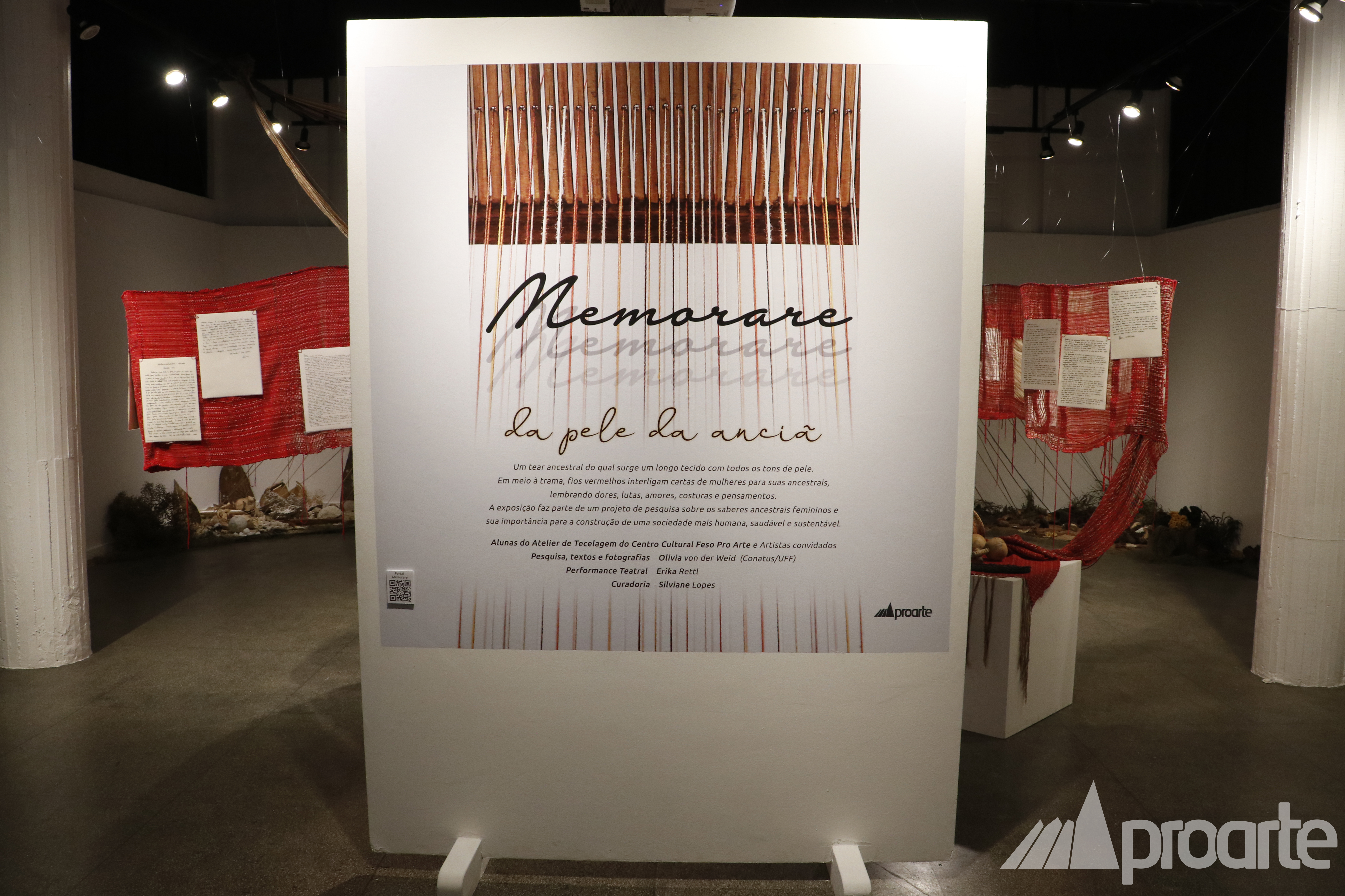 Um tear ancestral do qual surge um longo tecido com todos os tons de pele. Em meio à trama, fios vermelhos interligam cartas de mulheres para suas ancestrais, lembrando dores, lutas, amores, costuras e pensamentos. Realizada pelas alunas do Ateliê de Tecelagem do CCFPA e artistas convidados, a exposição "Memorare da Pele da Anciã" conta com a curadoria da Professora Silviane Lopes em parceria com a antropóloga Olivia von der Weid (CONATUS/UFF) através dos seus inspiradores textos e fotografias e com a participação da atriz Erika Rettl, que apresenta uma performance teatral. A exposição faz parte de um projeto de pesquisa sobre os saberes ancestrais femininos e sua importância para a construção de uma sociedade mais humana, saudável e sustentável."